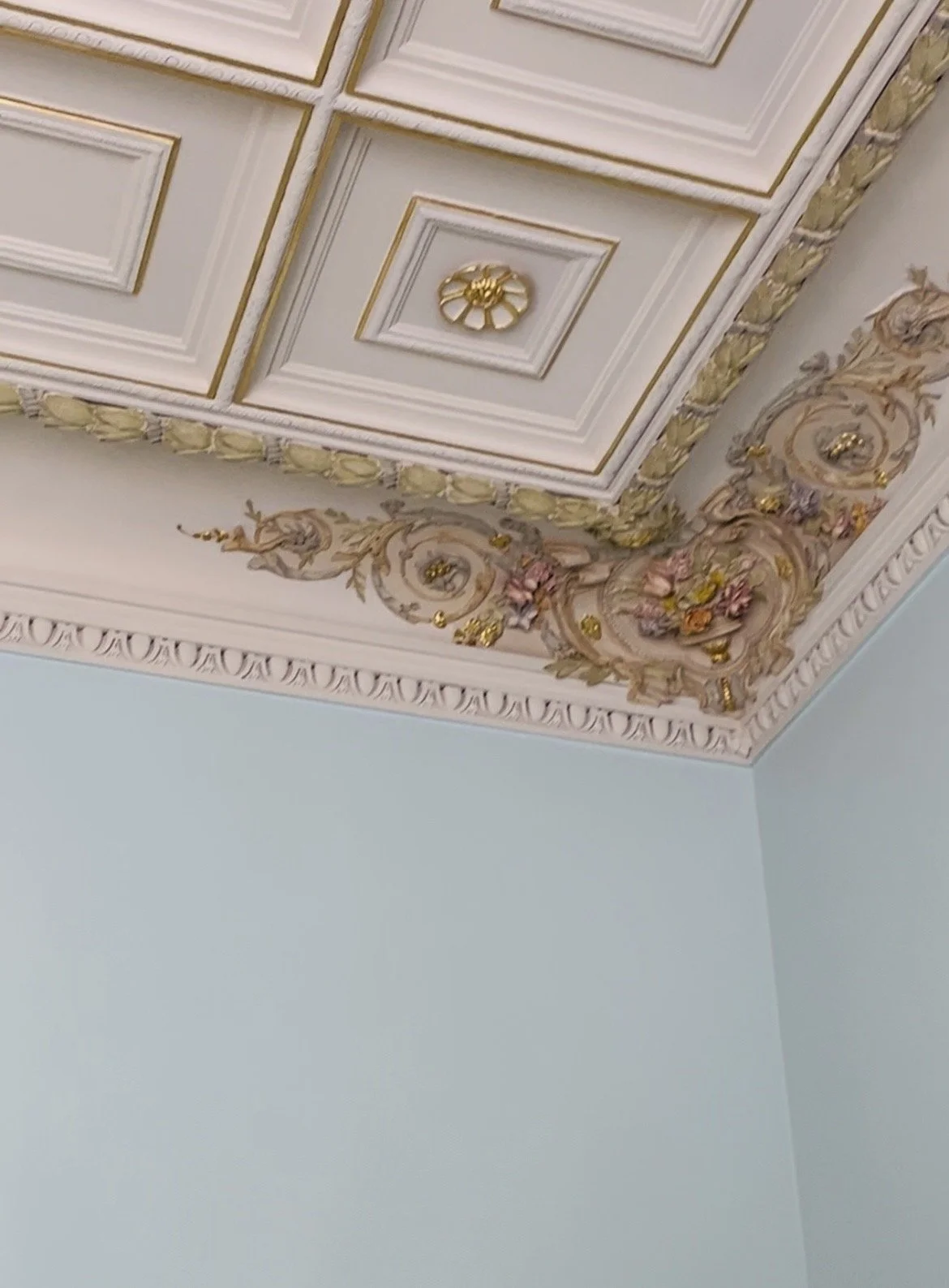 Restauration minutieuse des détails d'époque au plafond d'un appartement des années 1840, Paris 4ème